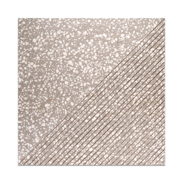 Carreau de terrazzo TS1-41M-R02 présente un style unique et moderne, avec des rainures décoratives servant de point fort. Couleur de fond : Gris chaud neutre et élégant. Granulats : Éclats de taille moyenne (M) blancs et gris clair, densément répartis, combinés à des rainures diagonales parallèles qui renforcent l’esthétique et améliorent l’adhérence. Dimensions : 600…