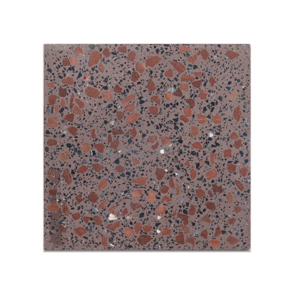 Terrazzo TS2-57M présente un style classique et luxueux, adapté à divers espaces.Couleur de fond : brun foncé chaleureuxGranulats : éclats de grande taille en rouge-orangé, noir et blanc, répartis de manière dense et uniformeDimensions : 300 x 300 mm